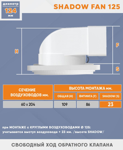 Высота теневого вентилятора всего 23 мм, а общая с обратным клапаном – 49 мм. Это позволяет рекордно высоко (!) устанавливать Ваш натяжной потолок, экономя драгоценные сантиметры.